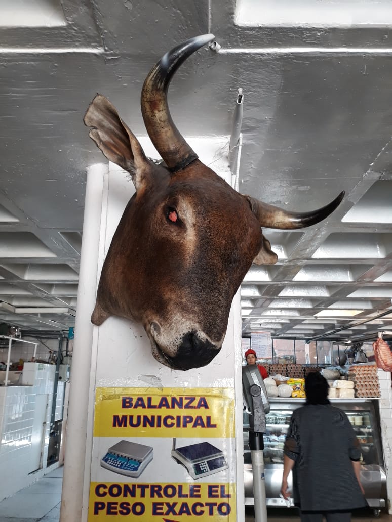 En la segunda planta están las carnes, pero lo que se percibe de entrada es el penetrante olor a cloro y desinfectantes . El punto de atención al subir por las gradas es una cabeza de toro con sus cuernos intactos y los ojos de cristal que parecen que te observan expectantes. Compramos un poco de queso de Rosa con su delantal blanco de volantes a los lados. Ya no se ve desorden, cada vendedor tiene su lugar asignado, el aseo se evidencia. Me pregunto desde cuándo es así un mercado, y qué tipo de relación tiene con su alrededor de pobreza, delincuencia y hasta drogadicción.